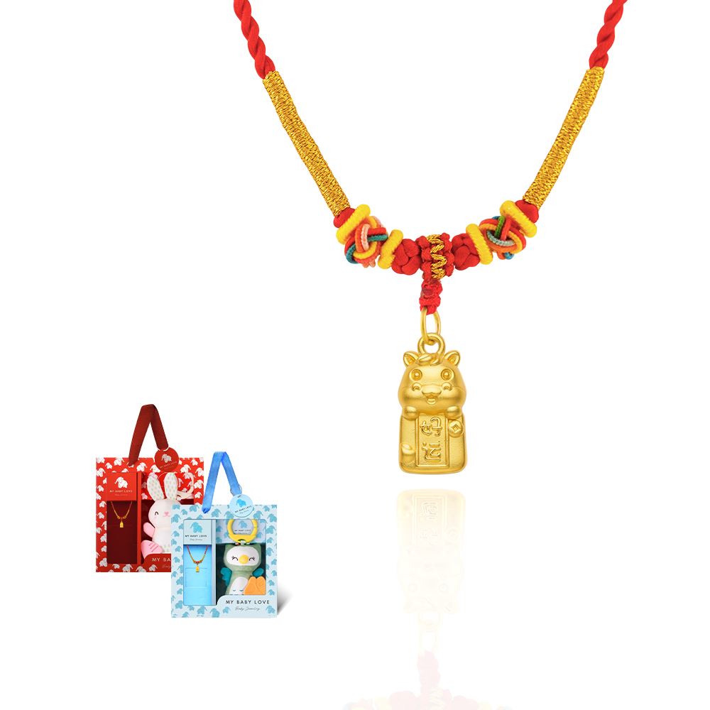 以可愛吉祥造型金飾,搭配手工編織紅繩,