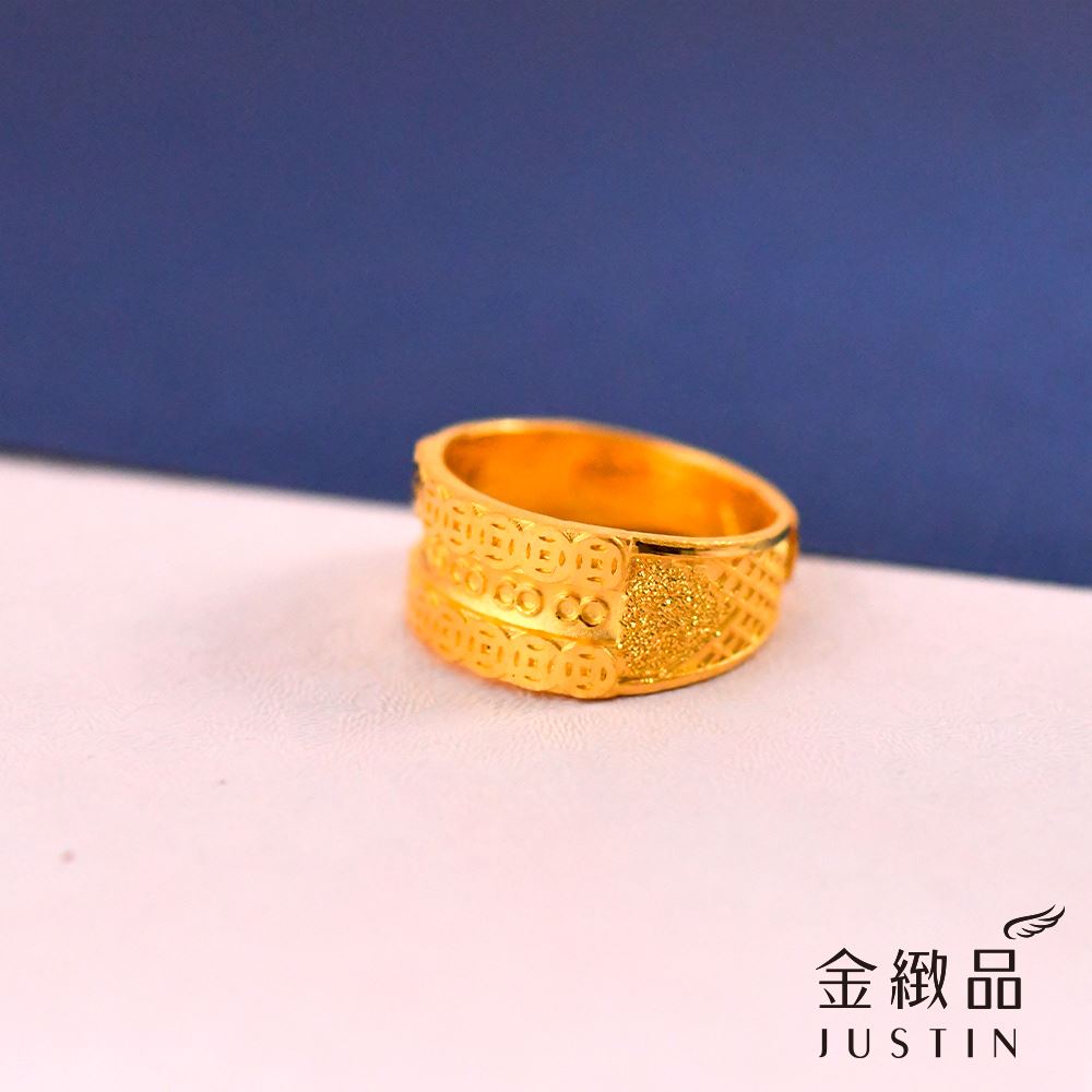 獨特的噴砂工藝搭配亮面錢紋設計,讓黃金呈現出豐富的視覺層次。