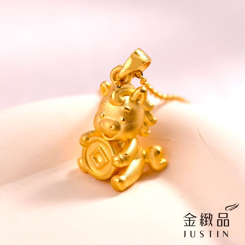 可愛小馬造型,手抱招財錢幣,結合童趣與吉祥寓意。